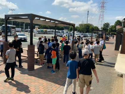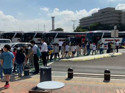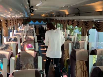 バスの中はパーティションも設置されています。三芳パーキングエリアでトイレ休憩です。順調です。