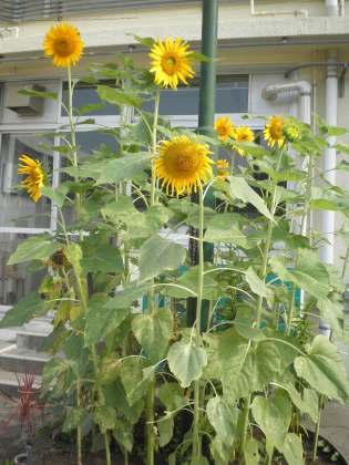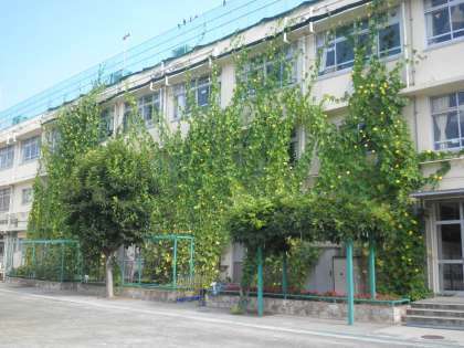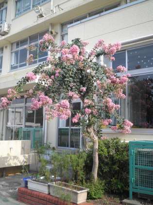 真夏の校庭にはたくさんの花が咲いています。ひまわりは、2メート近くまで伸びています。百日紅の花も鮮やかな花を咲かせています。また、グリーンカーテンも屋上まで伸びてきました。真夏の校庭も素敵なものがたくさんあります。