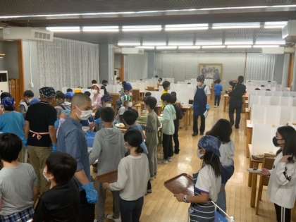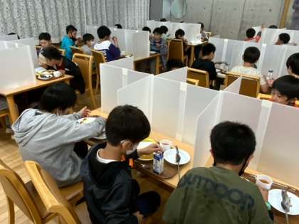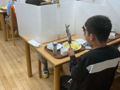夕食です。食事係さんが、配膳をします。今日掴み取りをマスもメニューに加わっています。