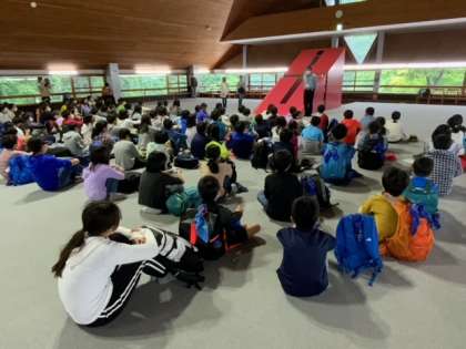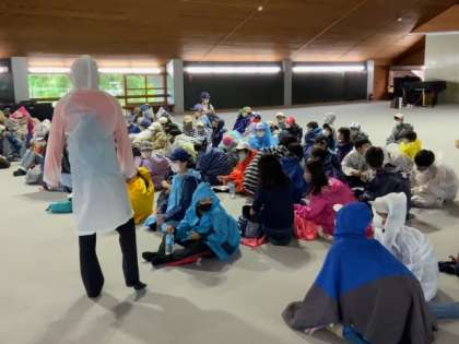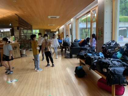 閉室式です。宿舎の方に感謝の気持ちを伝えました。荷物を号車ごとにまとめてあります。雨対策をして村めぐりの出発の準備をしています。