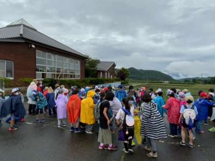 雨が上がりました。移り変わる風景を楽しみながら歩いています。水が流れているところでカエルを見つけた子どももいました。