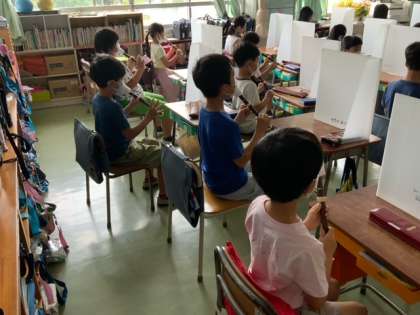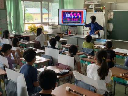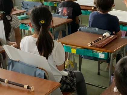 音楽でリコーダーの学習です。飛沫防止でマスクを付けたまま吹きます。タブレットのマイクに向かって吹くと採点してくれます。何人も挑戦しています。高得点が出ています。