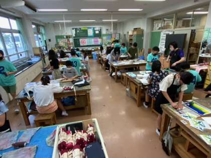 図工でパターン版画に取り組んでいます。2色を使って淡い色から濃い色へのグラデーションを付けます。