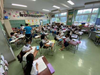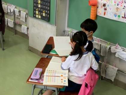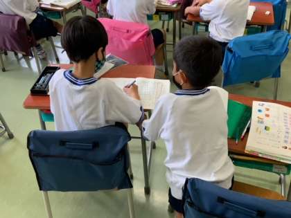 国語で、しりとりでことば遊びをします。近くのお友達としりとりをしています。