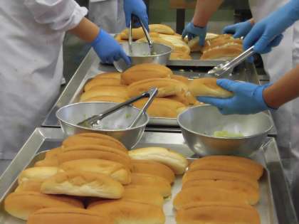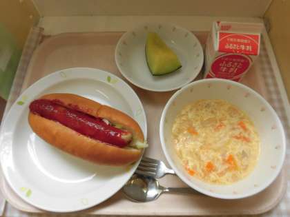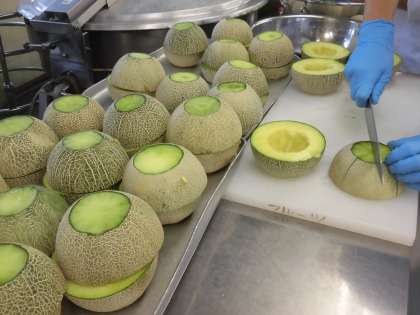 ☆今日のデザートは「アンデスメロン」です。よく熟されていてマイルドで、さっぱりとした甘みをしています。給食室で、たくさんのメロンを切りました。