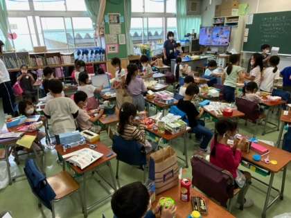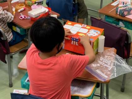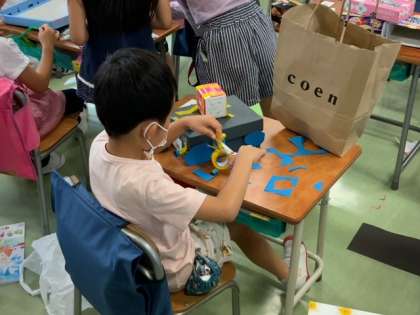 図工の「うきうきぼっくす」です。紙箱を使って、生き物や動物、乗り物、箱などに楽しく変身させていきます。