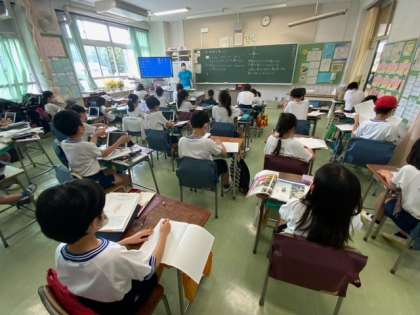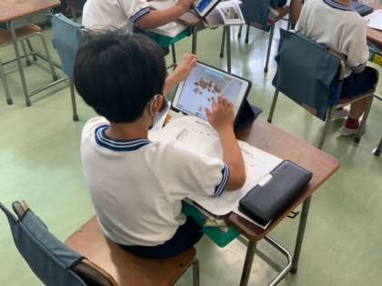 理科でヒマワリ、ホウセンカ、イネはどのように育ったかを観察カードやタブレットで撮った写真と比べながら調べていきます。