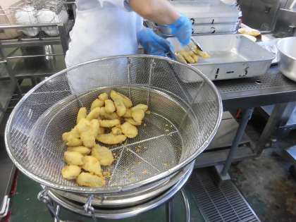 ☆今日は「セルフフィッシュサンド」です。魚(メルルーサ)に水でといだ小麦粉とパン粉をつけて給食室で丁寧に1つ1つ揚げました。子ども達は、それぞれパンに魚を挟んで食べました。