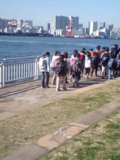 お弁当を食べる潮風公園です。ちょっと散策。海の向こうに高層の建物がたくさん見えます。羽田を飛び立つ飛行機も後ろに見えます。風もなく、暖かいです。
