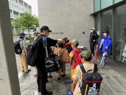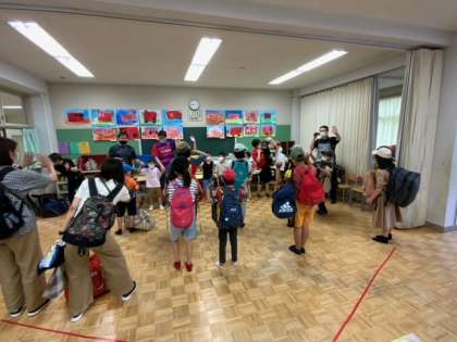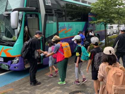 つくし学級の4年生から6年生までが、2泊3日で河口湖連合移動教室に出発します。出発式を終えて仙川駅近くでバスの到着を待っています。30分ほど遅れて9時40分に仙川を出発です。