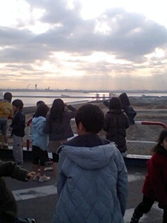 埋め立て地にバスでやって来ました。カラスや雀など、鳥がたくさんいます。埋め立て地の見学駐車場からの景色です。風が強く寒いです。