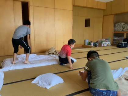 曇りです。着替えをして、布団をたたみ、朝の支度をしています。