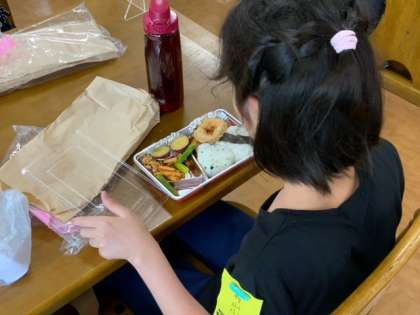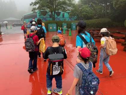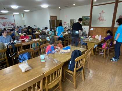 少し雨が降っています。富士サファリパークの食堂をお借りしての昼食です。学園から持ってきたお弁当を食べます。