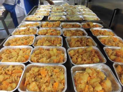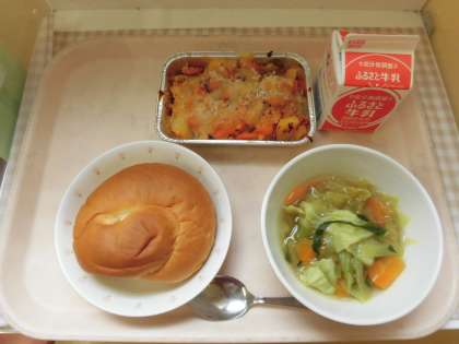 ☆今日は、たくさんのじゃがいもを使った「レンズ豆入りポテトグラタン」です。ご家庭では、なかなか使う機会も少ないと思いますが、グラタンにレンズ豆を入れることによって、たんぱく質も豊富にとれることができます。給食室では、調理員さん達が1つ1つカップに具材を入れチーズをかけてオーブンでこんがり焼きました。