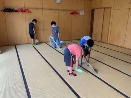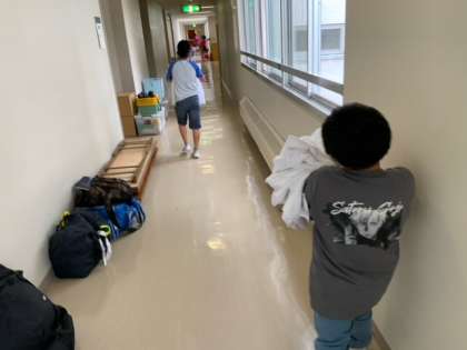 シーツを片付け、お部屋の掃除をします。女子は掃除を終えて道具を片付けに来ています。