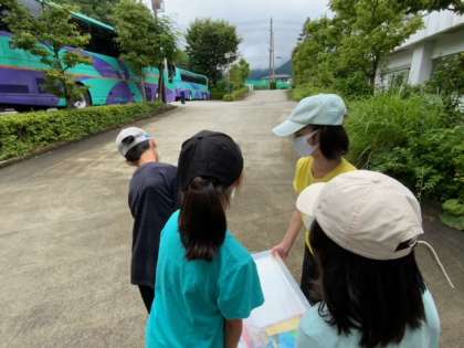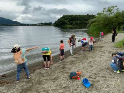 大きな荷物をバスに積み込み、記念撮影を撮って河口湖に遊びに来ました。この後、雨プログラムになります。