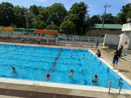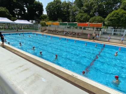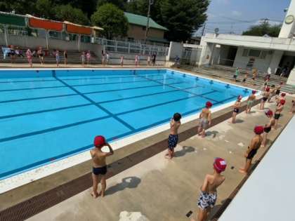 よいお天気です。1回ずつの水泳学習が始まりました。まずは、1年生と2年生の1クラスずつがペアとなって入ります。マスクを外しての活動になりますので、間隔を十分に取っています。水の中で様々な体の動かし方を体験します。