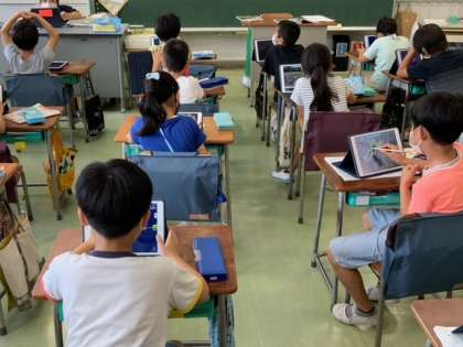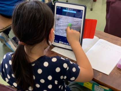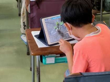 理科で植物のからだのつくりはどのような部分からできているのかを自分で撮った写真などをよく観て、根や葉や茎などタブレットに書き込んでいます。