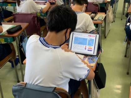 理科で台風がどのようにしてできていくのかをタブレット端末に送られてきた資料をよくみて、自分の考えを書いています。