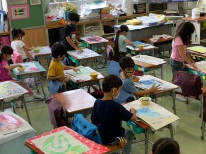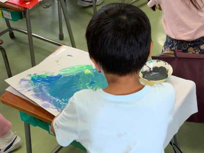 図工で、手や指でかく気持ちよさを感じて楽しみます。液体粘土を使います。