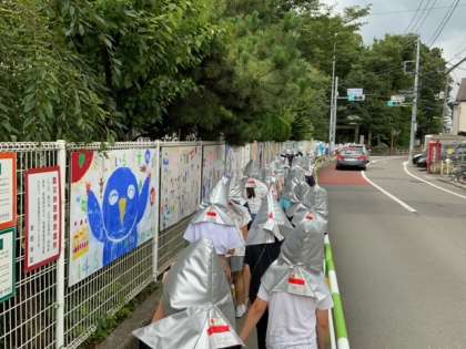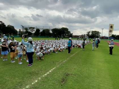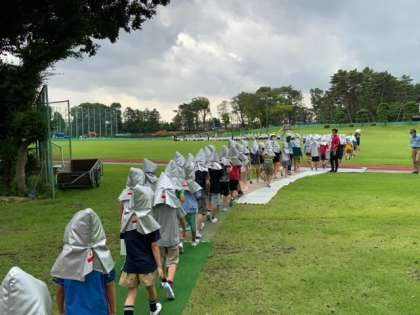 今回の避難訓練は第二次避難場所になっている第一生命グランドへ全員が避難しました。おしゃべりをしないで静かに避難できました。