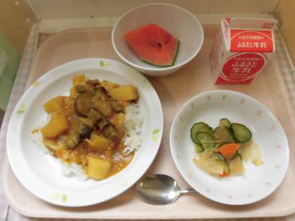 ☆今日の献立は「夏野菜カレー」です。カレーには かぼちゃ トマト なす ピーマン ズッキー二 たまねぎ にんじん じゃがいも とたくさんの夏野菜が使われています。苦手な野菜もカレーに入るとおいしく食べることができました。