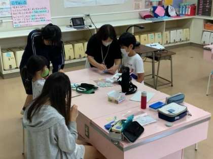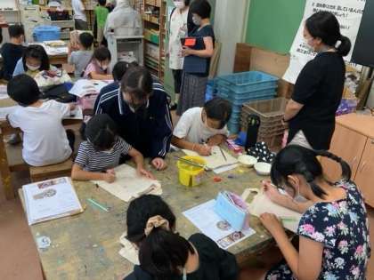 サマースクールの2日目です。アートエコバックでは、エコバックに自分の好きな絵を描いていきます。また、マスク作りでは、手縫いでマスクを作っていきます。
