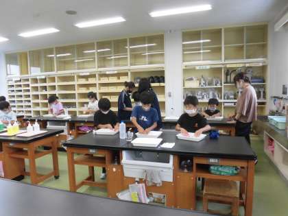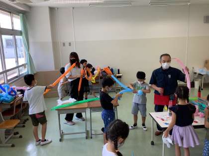 サマースクール3日目。今日は、理科実験教室(スライム作り)、ボッチャをしよう、バルーンアートの3つの教室が開かれまをした。スライム作りでは、材料を入れて割り箸で混ぜるうちにだんだん固まっていく様子に目を輝かせていました。バルーンアート教室では、自分で作った犬や剣などをみんな嬉しそうに持って帰っていきました。ボッチャ教室では、一投一投に盛り上がっていました。