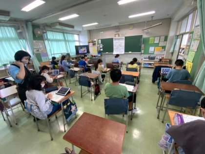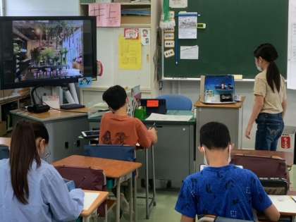図工で見本やお店のレイアウトを参考にしながら、デザインを考えています。
