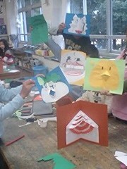 とび出すカードです。子どもたちは工夫をこらし、かわいらしいカードを作っています。自信作を持って、パチリ。