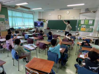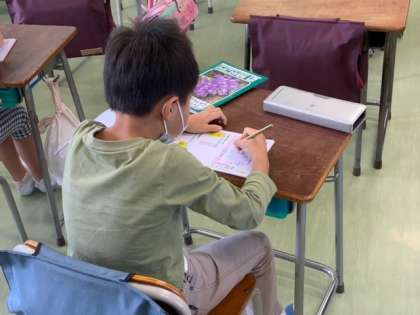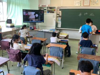 教室とお家とをオンラインで結び、同時に漢字の学習をしています。