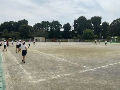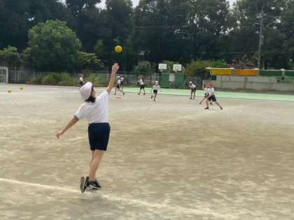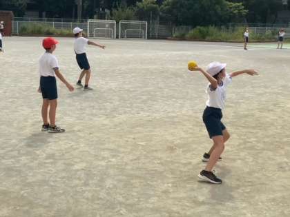 体育でボール投げに取り組んでいます。かなり間隔を空けて遠くまで投げることに挑戦しています。