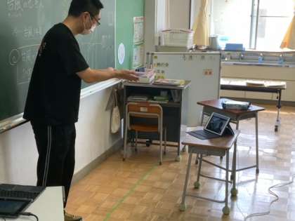 今日から通常登校とオンライン学習の選択制となります。つくし学級でもオンライン希望の子どもが自宅から授業に参加しています。皆で台風について学んでいます。