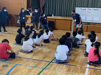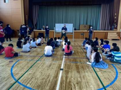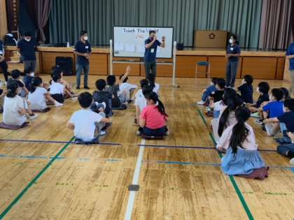 体育館で、4年生は1クラスずつ、英語体験授業の出張教室を受けました。