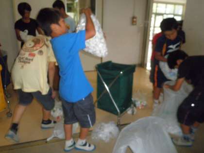 エコ委員会では、集めたボトルキャップをみんなで整理していました。