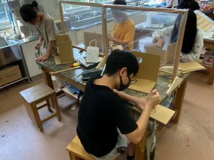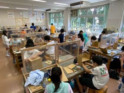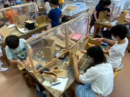 図工で店の形を自分のイメージに合わせて組み立てをどんどん進めています。まずは、段ボールでお店の壁をつくっています。