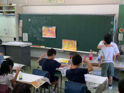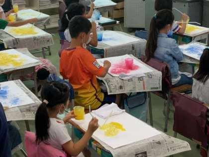 図工で泡模様を楽しくかいています。コップに入れた薄めた絵の具にストローで息を吹き込み、泡をつくります。泡をストローですくって、紙にのせてかいていきます。