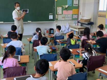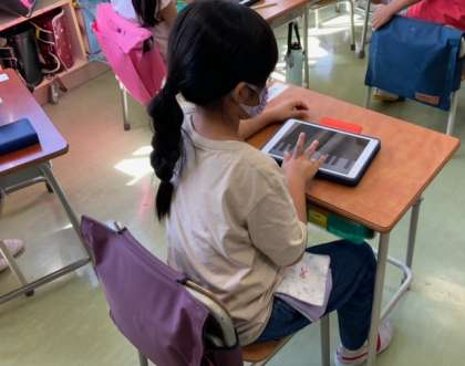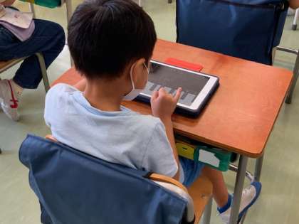 音楽で鍵盤ハーモニカの代わりにタブレット端末のアプリを使って鍵盤楽器の練習をしています。