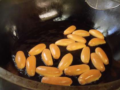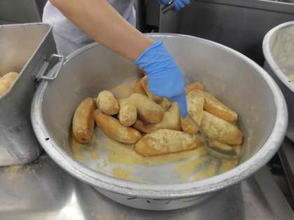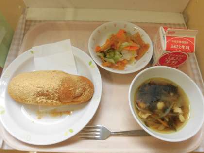 ☆今日はみんなが大好きな「きなこ掦げパン」です。給食室の大釜でコッペパンを掦げ、砂糖、きなこ、塩を混ぜたものをからめました。