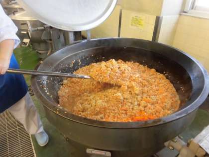 ☆今日はオリパラ給食で、インド料理です。今日の「キーマカレー」はガラムマサラやクミンを使用しカレーの奥深さを出しました。そして、サラダに入るモロヘイヤは原産地がインドで、アラビア語では「王様の食べる野菜」という意味があり栄養価の高い野菜として知られています。今日もたくさん作りました。