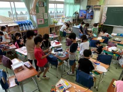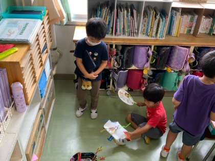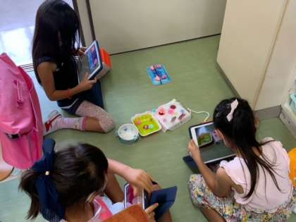 図工で風で動くおもちゃ「ふわふわゴー」をつくりました。仕上がったおもちゃをタブレットで写真を撮って先生に提出します。それが終わったらうちわであおいで遊んでいる子どももいます。