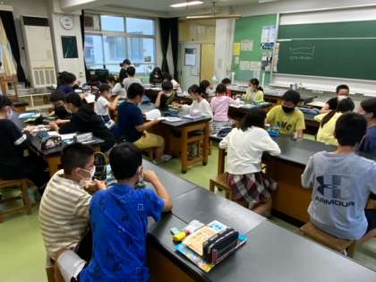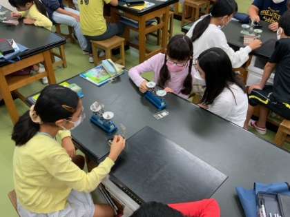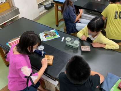 理科で上皿天秤を使って重さを量っていきます。身近な消しゴムや鉛筆削りの重さを量っています。