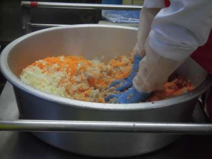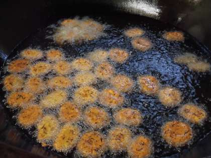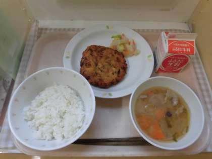 ☆今日は「手作りさつま揚げ」です。さつま揚には、タラのすり身、いかのすり身、しょうが汁、にんじん、たまねぎ、ひじき、塩、卵、でんぷん、パン粉を入れて混ぜ合わせ、小判型に丸めてから揚げました。やわらかい生地なので、調理員さん達は丸めるのにとても苦労しましたが、揚げ上がりは、ふわふわのさつま揚げの完成です。