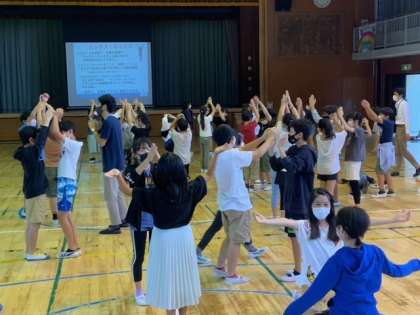 フリーザ・チルドレン・ジャパンのお二人をゲストティーチャーとしてお迎えして、5年生全体への出前授業です。SDGzへの取り組みとして、Gift(好きな事・得意な事)+Issue(解決したい社会問題)=Change(変化・アクション)をグループごとに話し合っていきます。この取り組みに前にミックス・ミックスでウオーミングアップから始めました。