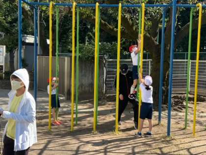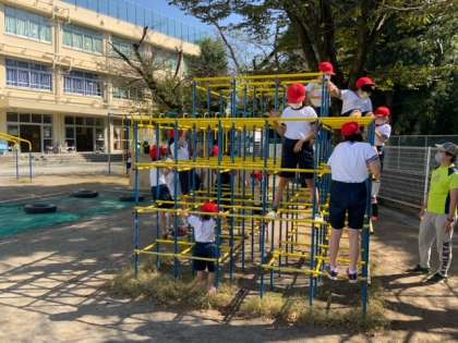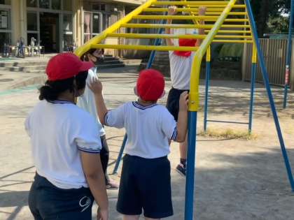 校庭の遊具を使って様々な体の動かし方を体験していきます。