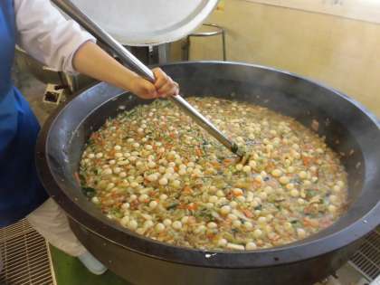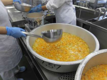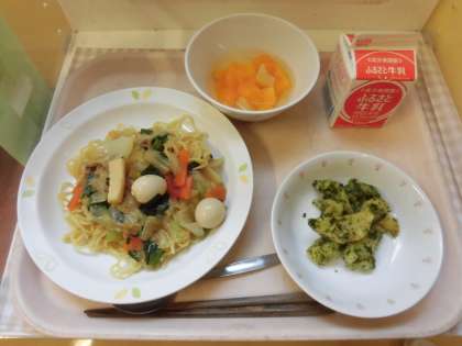 ☆今日は「五目あんかけ焼きそば」です。五目あんかけには、8種類の食材が入っていて栄養バランスがよい献立です。そして、デザートは子ども達の好きなフルーツポンチでした。
