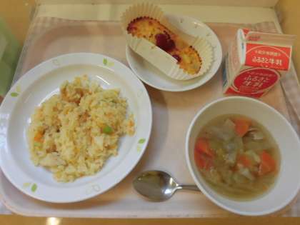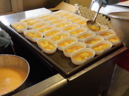 ☆今日の給食は、スペイン風オムレツです。名前のとおりスペインで作られた、たまご料理で、スペイン語でトルティーヤといいます。じゃがいも たまねぎ とりひき肉を炒め、たまごに混ぜ均等にカップに分けてオーブンで焼きました。トマトソースをかけて完成です。