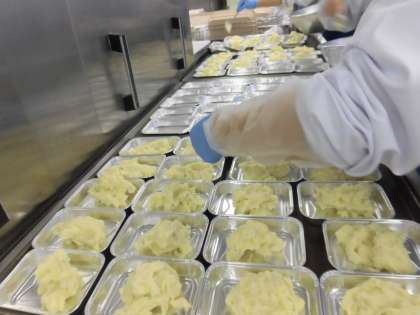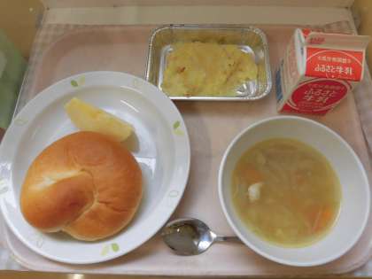 ☆今日の給食は、ポテトクリーム焼きです。グラタンに欠かせないじゃがいもの皮をむいて調理しました。じゃがいもをマッシュして炒めた、玉葱、とり肉を入れて牛乳、生クリーム、塩、こしょうで味付けをし、チーズをのせてオーブンで焼きました。