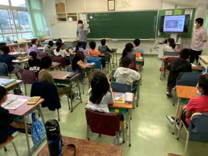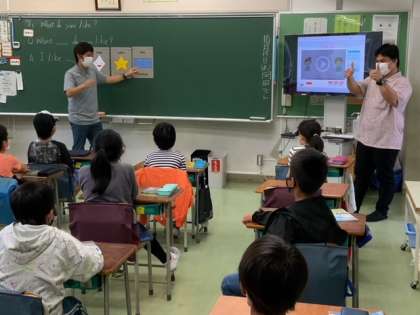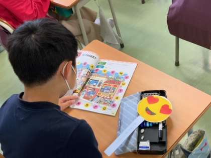 外国語学習で、好きなものや色を聞いて、応える学習をしています。What ~ do you like? I like ~. 他にも色や形の言い方を確認しています。