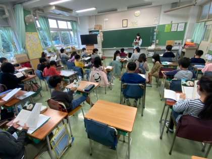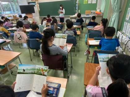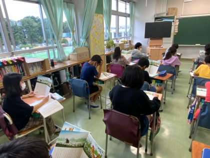 国語で「ごんぎつね」を一文一文をゆっくりと一人ずつ読み進め、難しい表現があると確認しながら、お話の様子を思い浮かべています。